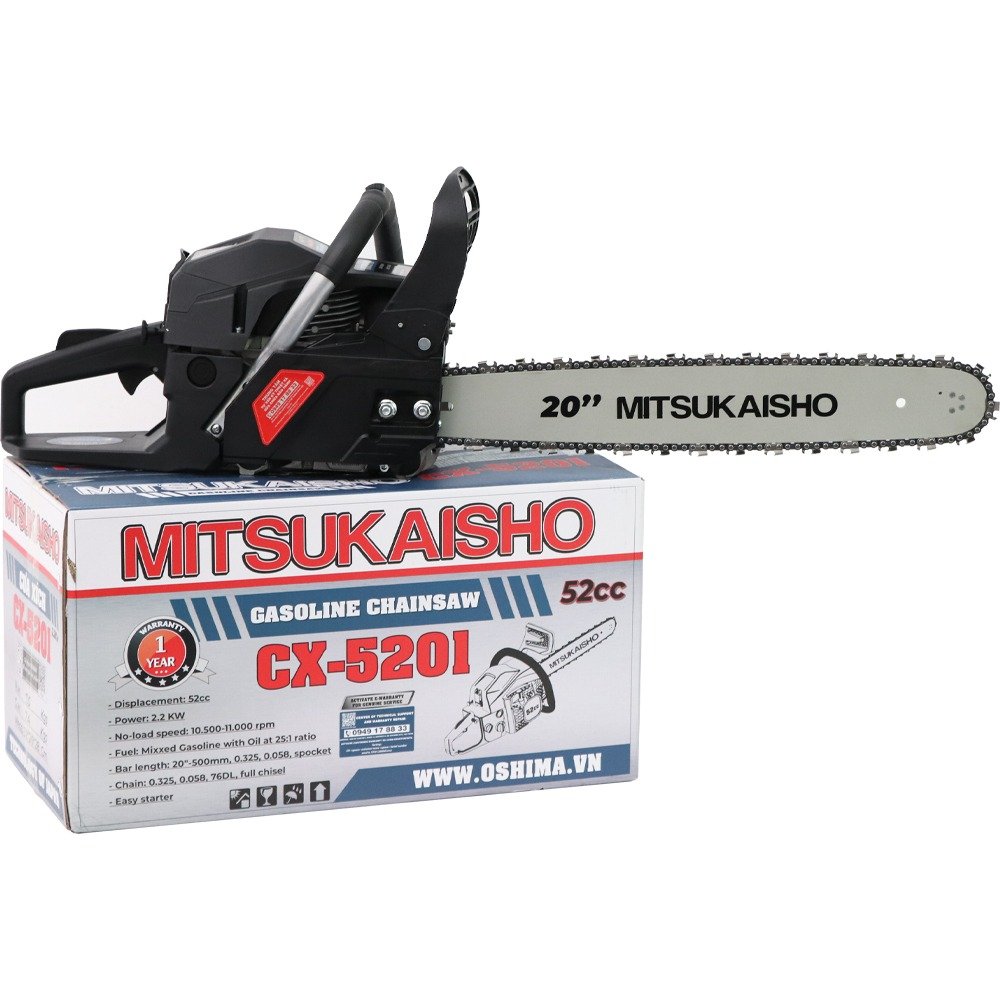 Cưa xích MITSUKAISHO CX-5201 2.2kW Sở hữu sức mạnh vượt trội, Cưa xích MITSUKAISHO CX-5201 2.2kW là trợ thủ đắc lực cho mọi công việc liên quan đến gỗ. Dù bạn cần cưa cây , cưa tỉa nhánh , hay thực hiện các dự án làm vườn , khai thác gỗ , chiếc máy