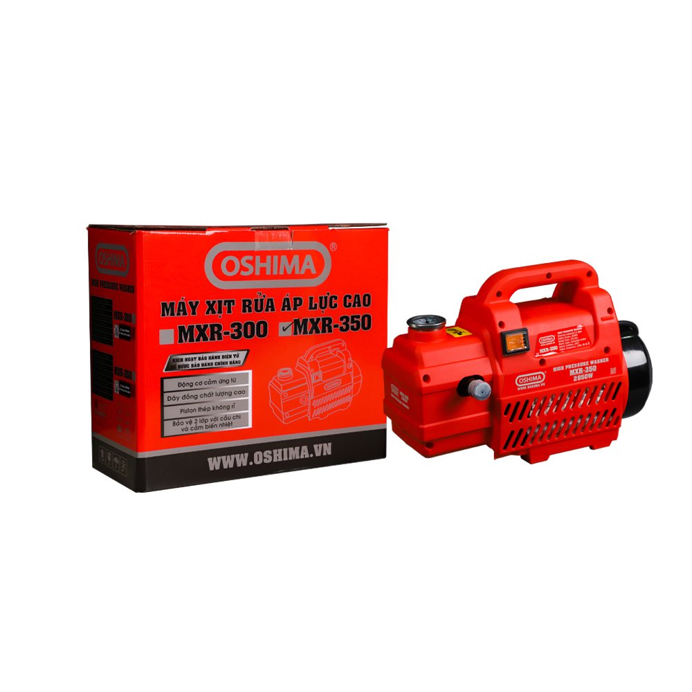 Máy xịt rửa OSHIMA MXR-350 2.85KW Đỏ-đen Điện 1 pha Máy xịt rửa cao áp OSHIMA MXR-350 là giải pháp làm sạch mạnh mẽ cho gia đình và doanh nghiệp. Với khả năng làm sạch vượt trội, máy rửa xe/máy xịt rữa xe giúp bạn dễ dàng loại bỏ bụi bẩn cứng đầu trên nhiều bề mặt. Công dụng: Xửa xe , xịt rửa sân nhà. Tưới cây, rửa lá, tẩy rêu trên gốc cây. Vệ sinh sàn xưởng, nhà máy, xí nghiệp. Vệ sinh máy lạnh. Sở hữu ngay máy xịt rửa OSHIMA MXR-350 để trải nghiệm sự tiện lợi và hiệu quả trong công việc làm sạ